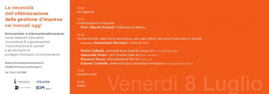 Parteciperanno all’incontro: Prof. Alberto Portioli, Politecnico di Milano, Pietro Galbiati, amministratore Galbiati Group Srl, Giancarlo Oriani, CEO Staufen Italia Srl, Giovanni Rossi, amministratore RDI Srl, Erasmo Corbella, direttore Ecipa Lombardia Formazione.