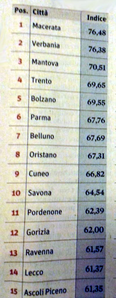 Per qualità dell’aria (Biossido di Azoto 33,50ug/mc) il capoluogo lecchese è 58esimo insieme a Cremona e Piacenza, ancor peggio, siamo 89esimi, riguardo al superamento giornaliero dei limiti di ozono (81 giorni); meglio per quanto riguarda le concentrazioni di Pm10 (24,50ug / mc) , 39esimi dopo Genova.