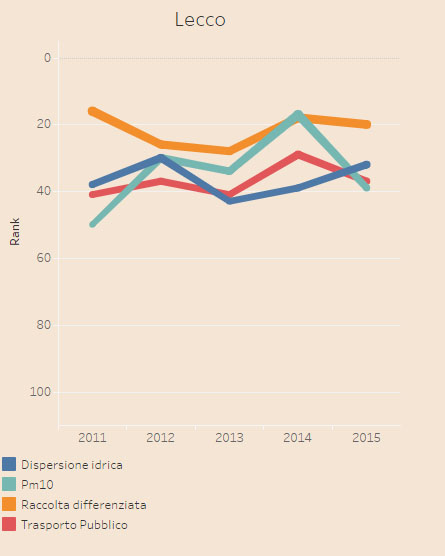 Infine, per quanto riguarda il verde pubblico, il capoluogo lecchese si pone al 31simo posto con una superficie pari al 22,24% di aree verdi sul totale della superficie comunale, ma con un peggiore 73esimo posto la fruibilità del verde in area urbana (14,1Mq / Abitante).