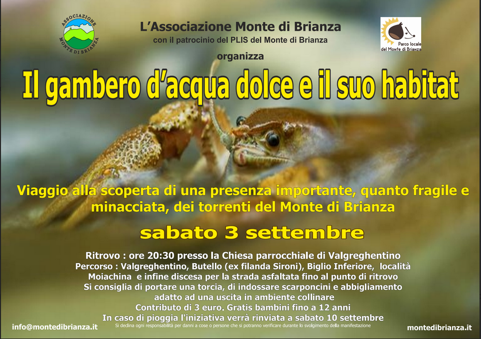 LECCO – L’Associazione Monte di Brianza organizza, con il patrocinio del PLIS del Monte di Brianza, l’uscita notturna “IL GAMBERO D’ACQUA DOLCE E IL SUO HABITAT”, un viaggio alla scoperta di una presenza importante, quanto fragile e minacciata, dei corsi d’acqua del Monte di Brianza.