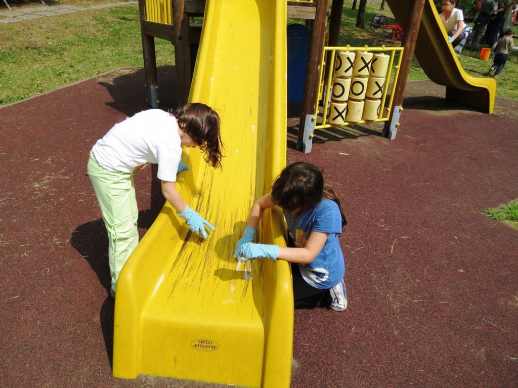 Poi nella pulizia, spugne e sapone alla mano, degli scivoli e delle altalene per la “gioia” dei papà presenti chiamati all’incessante rifornimento di abbondanti secchi d’acqua dalla vicina fontanella pubblica.