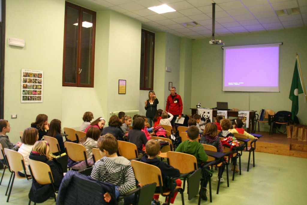 Dopo i saluti iniziali e la proiezione di un video sulle attività del WWF, la più grande associazione ambientalista presente in tutto il mondo, una serie di immagini ha presentato ai bambini il riccio e la volpe, il lupo e il capriolo… di ogni animale sono state illustrate alcune caratteristiche, gli ambienti in cui vive ed è stato possibile ascoltare il “verso”: dal grugnito del cinghiale al bramito del cervo, la sala CFA di Villa Bertarelli si è riempita dei suoni della natura. La bravura nel distinguere le diverse specie e le conoscenze di alcuni bambini hanno stupito persino gli stessi organizzatori. A seguire i bambini sono stati divisi in squadre per un gioco in cui, su dei tabelloni che illustravano i vari ambienti naturali, i bambini dovevano collocare le sagome degli animali selvatici nel giusto habitat: pianura, collina, montagna…