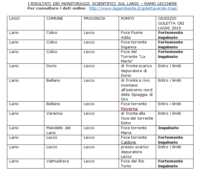 Si tratta nel dettaglio: della foce del fiume Adda, della foce del torrente Inganna e della Merla tutte e tre a nel comune di Colico; della foce del torrente Caldone a Lecco e di quella del Rio Torto a Valmadrera. Giudizio “inquinato” per la foce del torrente Meria a Mandello sul Lario.