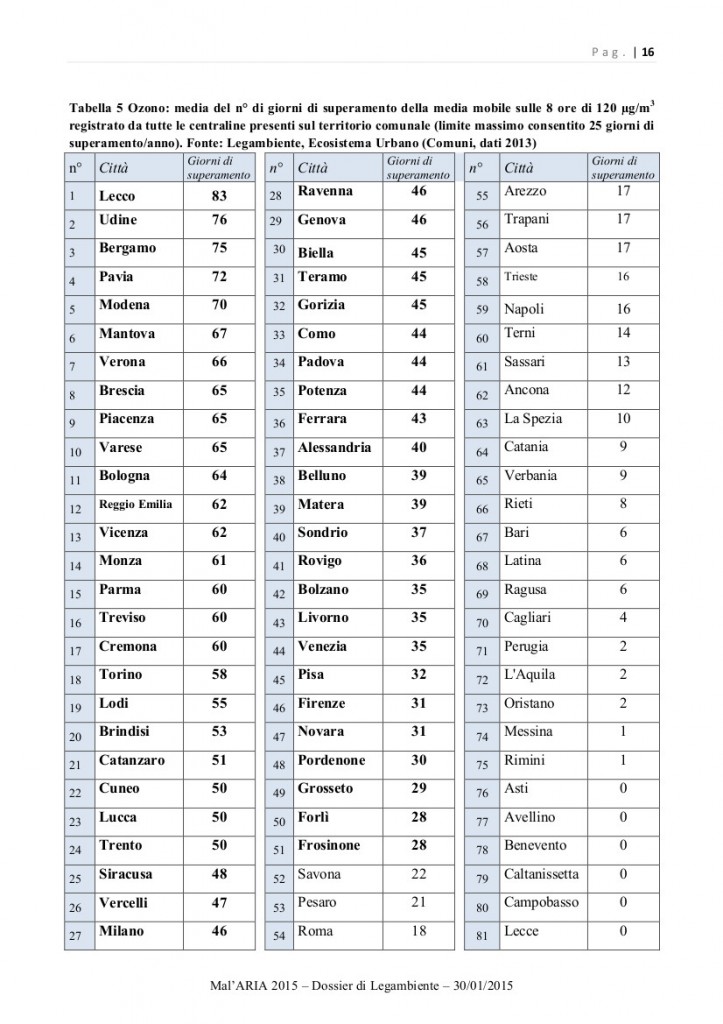 A guida questa speciale classifica in negativo è Frosinone, la peggiore, con 110 giorni di superamento del limite, staccata al secondo posto Alessandria (86), seguita da Benevento, Vicenza e Torino con 77 giorni. Come anticipato, nota positiva invece per Lecco, che insieme a Como, Sondrio e Varese non ha registrato superamenti.