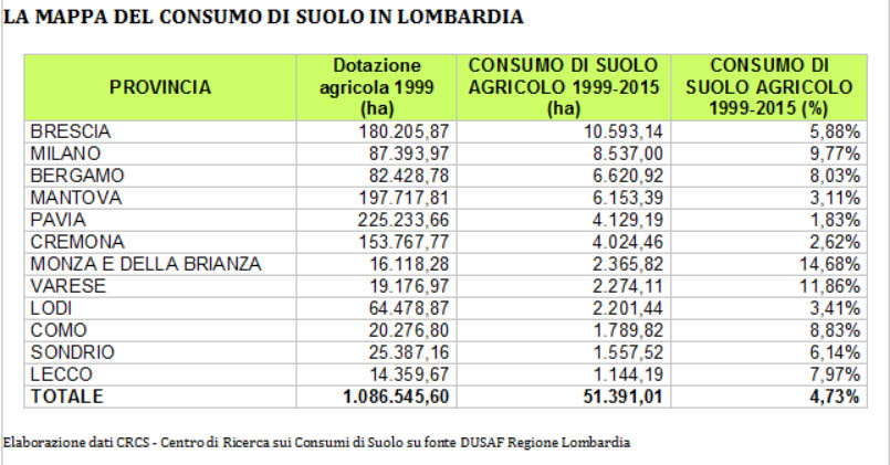 A livello regionale il 30% dei terreni coltivabili è stato abbandonato o trasformato in insediamenti residenziali, capannoni e nuove autostrade, molto spesso meno utili del previsto: basti vedere quello che è successo con la BreBeMi (Autostrada A35) e le sue opere accessorie. Lecco