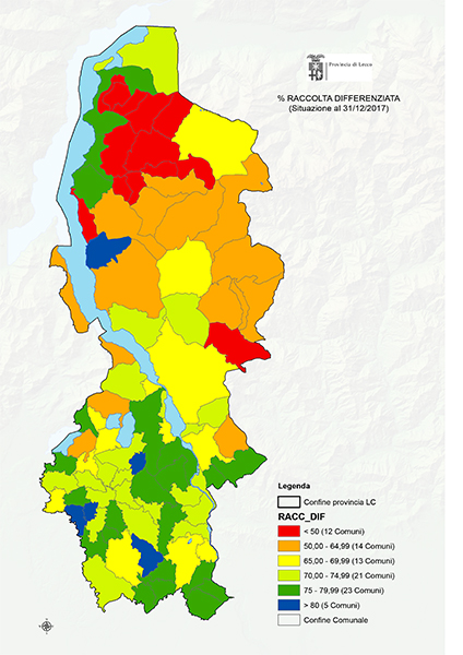 Quasi tutti i Comuni hanno sensibilmente migliorato la propria percentuale di raccolta differenziata; in particolare si distinguono Vercurago con il 73,9% (dal 59° al 35° posto), Perledo (dal 50° al 20° posto), Colle Brianza (dal 35° al 9° posto) e Torre de’ Busi (dal 32° all’8° posto). Lecco passa dal 57,2% al 65,4%, collocandosi al 62° posto nella graduatoria provinciale.