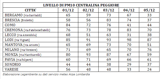 A Lecco, secondo i rilevamenti della centralina di via Amendola, i livelli di polveri sottili sono andati oltre i limiti l’1 dicembre (68 mgr/mc) il 2 dicembre (51 mgr/mc) e il 3 dicembre (63 mgr/mc) tornando sotto la soglia di allarme il 4 dicembre (38 mgr/mc) e il 5 dicembre (38 mgr/mc).