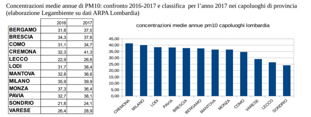 Il record di città più inquinata spetta a Cremona: “la cittadina padana non è esente da emissioni da traffico, industria e impianti termici, ma sicuramente pesa molto il contributo delle emissioni agrozootecniche, da cui dipende gran parte della formazione di particolato secondario che aleggia sulla Pianura Padana – spiegano da Legambiente -Solo Cremona eccede nel 2017 il dato medio di inquinamento tollerato secondo gli standard europei, ma nessuna città può vantare un’aria veramente salubre, conforme cioè alle raccomandazione dell’OMS che abbassano l’asticella del PM10 ad una media annua inferiore a 20 mg/mc, anche se Sondrio ci si avvicina chiudendo l’anno con una concentrazione media di 24,1 mg/mc”.