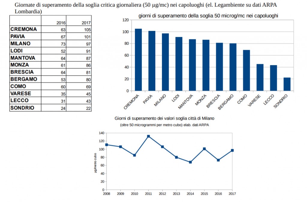 LECCO – L’anno che si è chiuso ha fatto registrare un chiaro peggioramento dei dati di inquinamento dell’aria rispetto al 2016: in tutti i capoluoghi, tranne Monza, le concentrazioni medie di PM10 sono cresciute, complici sia la minor piovosità, registrata soprattutto nelle località della bassa Padana, sia il generalizzato aumento del traffico veicolare.