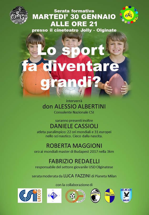OLGINATE – E’ in programma per martedì 30 gennaio al teatro Jolly di Olginate un incontro dal titolo “Lo sport fa diventare grandi?”, organizzato dall’oratorio San Giuseppe e dal Gso in collaborazione con il Csi di Lecco e altre realtà sportive del territorio. L’appuntamento avrà inizio alle ore 21 e vedrà sul palco personalità di spicco del mondo dello sport.