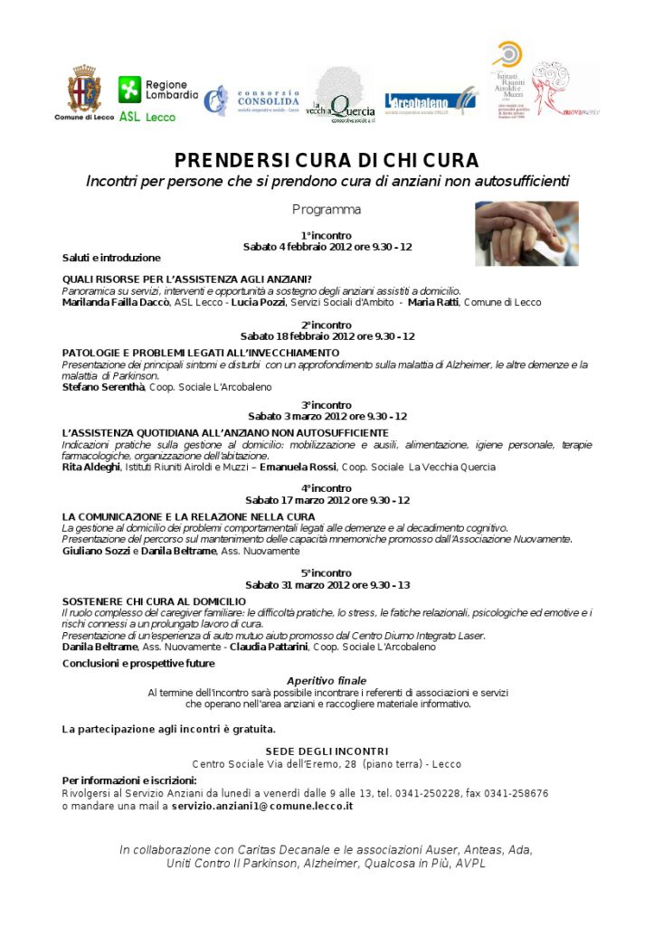 “Prendersi cura di chi ha cura”. E’ questo il titolo del ciclo di incontri di sostegno che il Comune di Lecco, in collaborazione con ASL Lecco e Consorzio Consolida, organizza per le persone che si prendono cura degli anziani non autosufficienti.