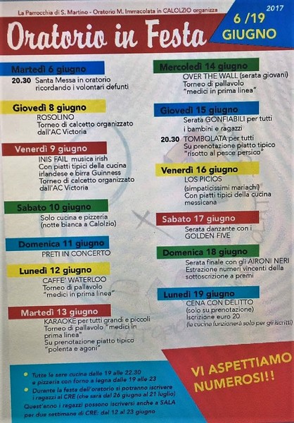 CALOLZIO – Torna, dal 6 al 19 giugno, l’imperdibile Festa dell’Oratorio Maria Immacolata a Calolzio. Fra le tante iniziative, diverse per ogni serata, ce ne sarà davvero per tutti i gusti; dal torneo di calcetto, al ballo liscio, passando per la serata a tema irlandese e l’esibizione dei ‘Preti in concerto’ domenica 11. Tutte le sere sarà attivo il servizio cucina dalle 19 alle 22.30 e pizzeria fino alle 23.