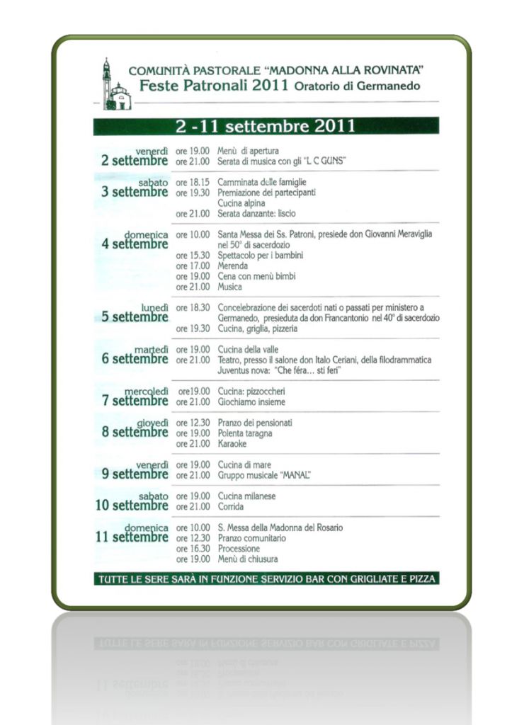 AgendaAttualitàCircondario A Germanedo al via le Feste Patronali Di Lorenzo Colombo - 23/08/2011 Facebook Twitter WhatsApp Linkedin Email Telegram Tempo di lettura: < 1 minuti Dal 2 all’11 settembre nel rione di Germanedo si terranno le feste patronali. Di seguito il PROGRAMMA