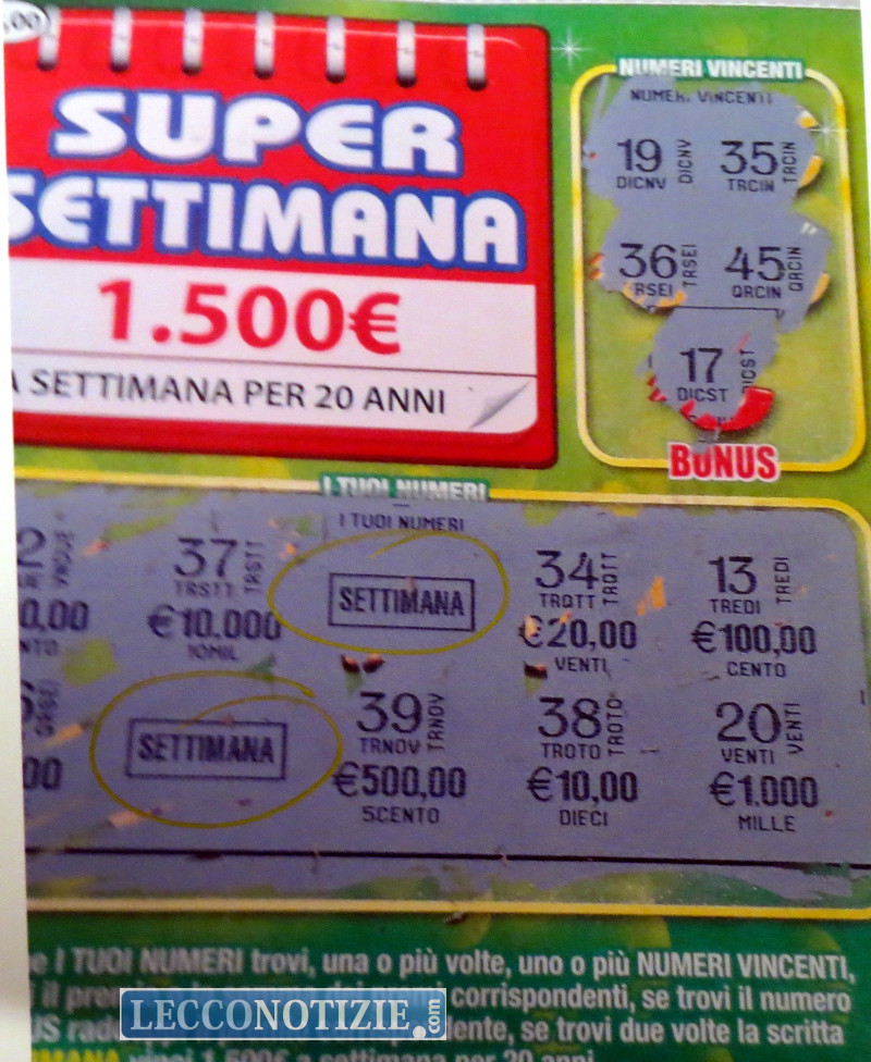 LECCO – A Lecco saranno pure vietati i botti, ma quello “esploso” questa mattina al bar Sole di via San Michele dal Carso a Malavedo (Lecco) è uno di quelli che fanno rumore. Con una “grattata” da 5 euro, una ragazza si è aggiudicata il massimo della vincita al “Gratta e Vinci” “Super Settimana” ovvero 1500 euro la settimana per i prossimi 20 anni. State facendo i conti? Vi aiutiamo noi, sono 78 mila euro all’anno, per un totale di 1 milione e 560 mila euro.