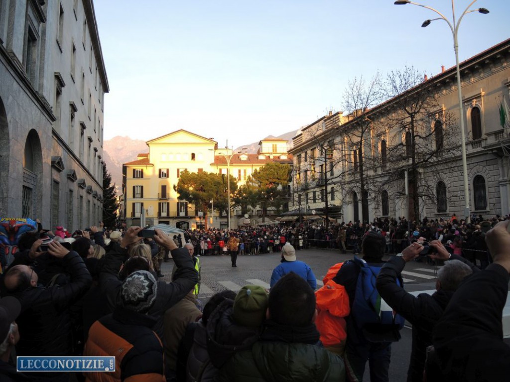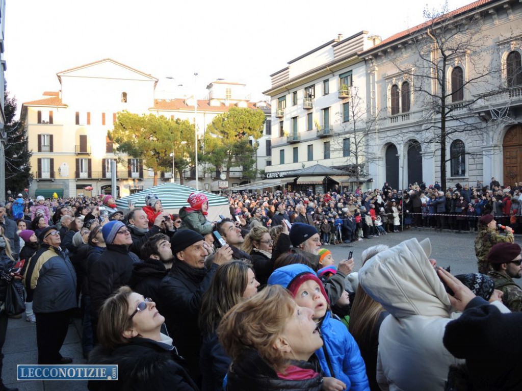LECCO – Se l’immaginario collettivo la dipinge come una vecchietta un po’ gobba dal naso curvo e le scarpe rotte a cavallo di una scopa malconcia lo spettacolo di oggi dovrà far ricredere: la Befana, a Lecco, è arrivata dal cielo sì, ma con un paracadute, regalando un’emozionante spettacolo ai migliaia di cittadini radunatisi col naso all’insù nelle piazze del centro città.