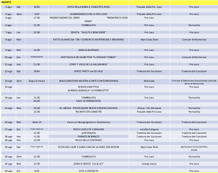 Il primo appuntamento è quello con la festa della birra e il concerto rock organizzati dalla pro loco, che si terranno la sera del 5 agosto, presso il piazzale della pro loco.