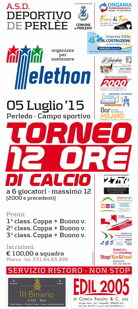 PERLEDO – Ogni anno nel mese di luglio si svolge a Perledo un torneo di calcio a 5 dedicato a Telethon dal gruppo sportivo ASD Deportivo de Perlèe. Il torneo di 12 ore di calcio infiammerà come di consueto l’estate calcistica di Perledo. Il tutto avverrà il 5 luglio presso il locale campo sportivo per sostenere la ricerca scientifica per combattere le 7000 malattie genetiche: in una sola parola Telethon.