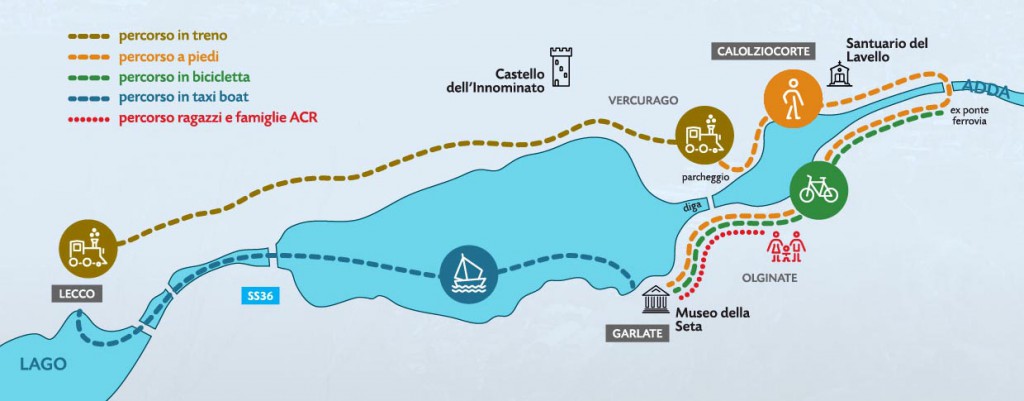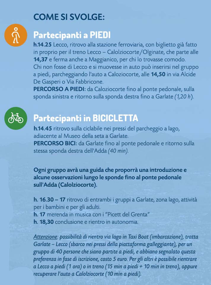 Sono infatti previsti due percorsi con varie modalità: un primo ritrovo è fissato alle 14.25 alla stazione ferroviaria di Lecco per raggiungere in treno Calolziocorte (ognuno si deve procurare il proprio biglietto) e da qui, altro eventuale ritrovo alle 14.50, dirigersi verso il ponte pedonale e poi Garlate (un’ora e venti minuti di camminata). Per il ritorno sarà possibile usufruire anche del Taxi-boat.