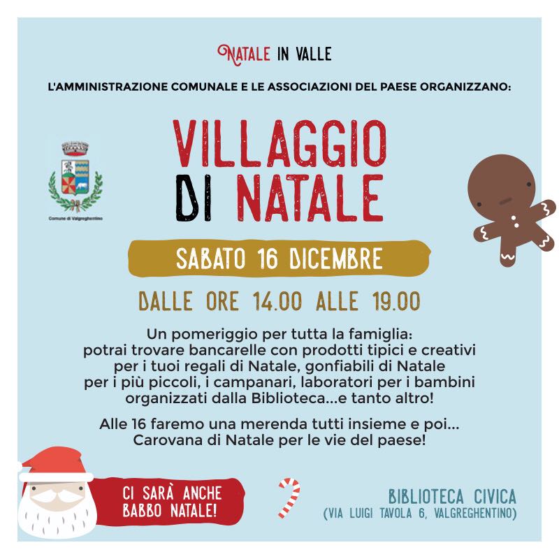 VALGREGHENTINO – L’amministrazione comunale e le associazioni del paese organizzano il Villaggio di Natale. Sabato 16 dicembre, dalle 14 alle 19, verrà organizzato un pomeriggio dedicato alle famiglie.