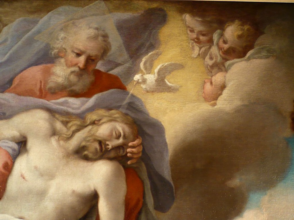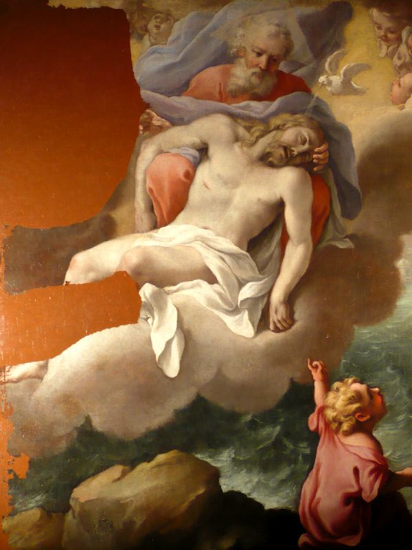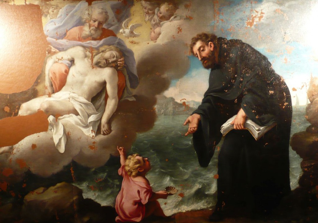 Nell’angolo in alto a sinistra il quadro raffigura le tre persone della Trinità nella gloria del cielo. In basso un bambino, con una conchiglia, cerca di spostare l’acqua del mare in una buca, sotto gli occhi incuriositi di Agostino. La tradizione vuole infatti che mentre il santo stava meditando sul mistero della Trinità, al quale avrebbe poi dedicato un trattato, vide un fanciullo sulla spiaggia intento a travasare l’acqua del mare dentro una buca. Allora lui intervenne e gli disse: “Com’è possibile che l’acqua del mare possa essere contenuta in una piccola buca?”. E il bambino, che in realtà era un angelo, rispose: “Com’è possibile che il mistero della Trinità sia nella tua testa?”.