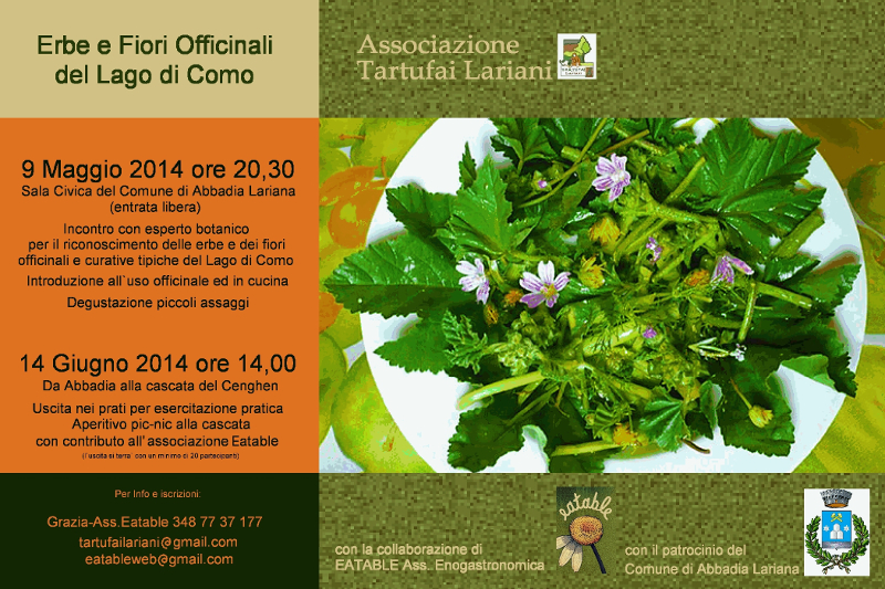 ABBADIA LARIANA – L’Associazione Tartufai Lariani e l’Associazione Eatable con il Patrocinio del Comune di Abbadia Lariana organizzano il prossimo 9 Maggio presso la sala civica di Abbadia Lariana ore 20:30 un’incontro con esperto botanico in cui si parlera’ di erbe e fiori officinali del lago di Como .