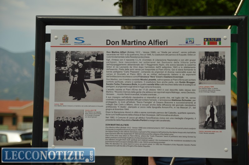 “Don Martino era il mio precettore all’oratorio – ha ricordato commosso Monsignor Locatelli – si recava spesso in Erna per aiutare i partigiani, ma un giorno fu costretto ad andarsene a Milano perché gli stavano dando la caccia; finita la guerra tornò nel nostro paese e fondò la chiesa del Caleotto. Era un uomo gentile, altruista e originale e proprio in suo onore e in onore di tutti i protagonisti della resistenza dobbiamo cercare di capire cosa hanno fatto loro in passato per poterlo adattare al nostro ambiente, ‘regalando rispetto e amore’ come direbbe don Martino se fosse qui oggi”.
