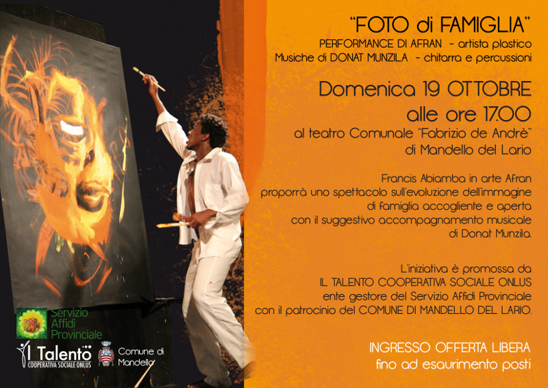 Denominato significativamente “Foto di famiglia”, consisterà in una performance dell’artista Afran, nome d’arte di Francis Abiamba, il quale proporrà uno spettacolo sull’evoluzione dell’immagine di famiglia accogliente e aperta avvalendosi del suggestivo accompagnamento musicale di Donat Munzila, che si esibirà alla chitarra e alle percussioni. Lo spettacolo avrà inizio alle ore 17 e l’ingresso sarà a offerta libera.