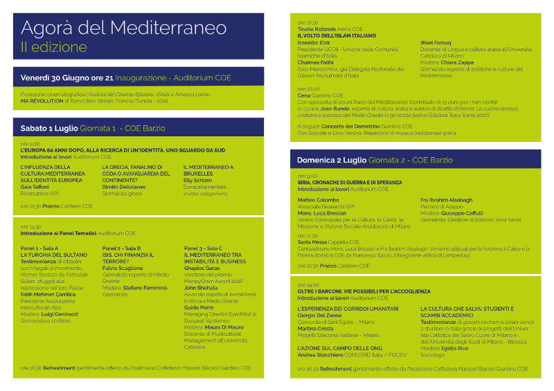 La serata, moderata da Chiara Zappa, esperta di politiche e culture del mediterraneo, prevede un dibattito in cui si alterneranno personalità culturali di spicco, tra cui Izzedin Elzir, presidente Ucoii (Unione delle comunità islamiche d’Italia). Alle ore 20 è prevista una cena in cui Joan Rundo, esperta di cultura araba, proporrà specialità gastronomiche di alcuni paesi del mediterraneo.