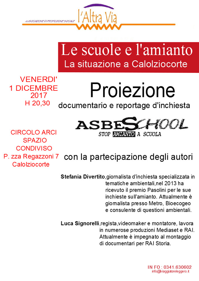 CALOLZIOCORTE – L’associazione “L’altra via” affronta il tema della presenza dell’amianto nelle scuole. Lo farà con la proiezione di un reportage che documenta la situazione a livello nazionale. Saranno presenti la giornalista Stefania Divertino, che ha curato l’inchiesta, e il regista Luca Signorelli. Un problema presente anche a Calolziocorte di cui si sta occupando anche il gruppo civico Cambia Calolzio.