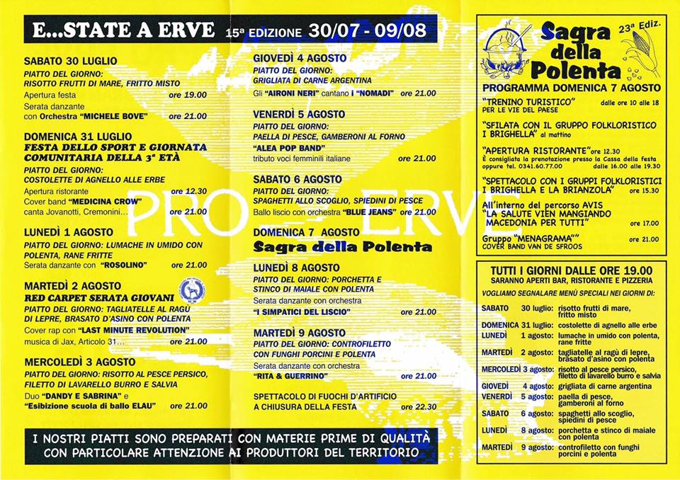 Una vera e propria festa che da 15 anni fa incetta di visitatori tra villeggianti e residenti che grazie alla Pro Loco di Erve e ai suoi numerosi volontari, potranno passare una settimana all’insegna del divertimento e della buona cucina. Gli eventi degni di nota sono: la festa dello sport e giornata comunitaria della terza età che si terrà domenica 31 luglio, la serata giovani red carpet il 2 agosto, il concerto degli “Aironi Neri” storica cover band dei “Nomadi” e la sagra della polenta domenica 7.