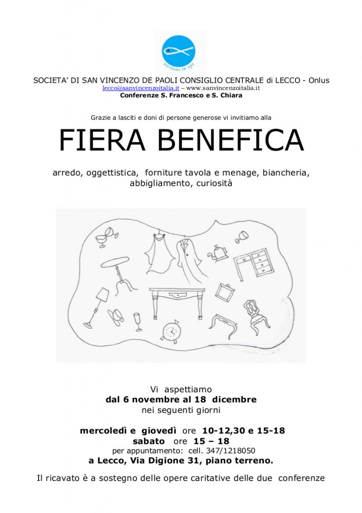 LECCO – Aprirà i battenti il prossimo 6 novembre a Lecco la Fiera Benefica promossa dalla Società di San Vincenzo de Paoli (Conferenze S. Chiara e S. Francesco) in uno spazio davvero insolito: l’interno di un appartamento completamente ”arredato” per l’occasione con oggettistica, teleria, complementi d’arredo e menage, abbigliamento, curiosità e molto altro!