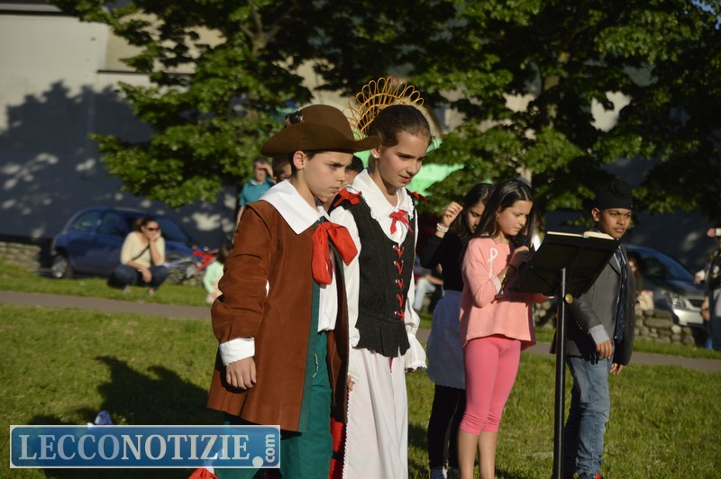 LECCO – “Quel ramo del lago di Como che volge a mezzogiorno tra due catene non interrotte di monti”, l’incipit manzoniano lo conosciamo tutti, così come la storia dei Promessi Sposi, ma recitata da un’intera scuola elementare lungo un percorso itinerante è tutta un’altra “storia”, una rappresentazione unica “che renderebbe orgoglioso lo stesso Manzoni”. 5 classi della scuola elementare “E. Toti” di Maggianico , martedì sera lungo la pista ciclabile che da via Bruno Buozzi conduce in piazza Era, hanno dato vita allo spettacolo “All’era del Manzoni” riproponendo gli episodi più significativi dei “Promessi sposi”.