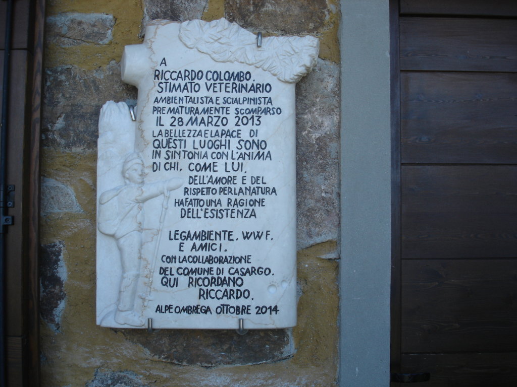 Sul muro del Rifugio Ombrega, Legambiente, WWF e gli amici di Riccardo, raccogliendo un’idea di Beppe Magni e Filippo Colombo, hanno voluto collocare una targa commemorativa.