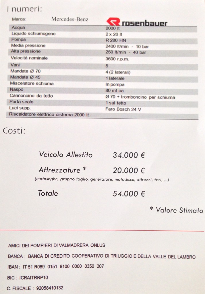 “Di fronte alla crescente quantità di eventi meteorologici di forte intensità che negli ultimi anni hanno colpito il nostro territorio – spiegano i vigili del Fuoco volontari di Valmadrera– e alla luce dei numerosi interventi riguardanti calamità naturali, abbiamo deciso di iniziare una lunga strada in salita che, grazie all’aiuto dei nostri concittadini, speriamo ci porterà all’acquisizione di un Unimog: un mezzo 4×4 che ci permetterebbe di raggiungere anche le località in montagna e i luoghi più stretti, attualmente in cui non riusciamo a passare con i nostri camion. L’Unimog U1700 l che vorremmo acquistare proviene dal distaccamento dei Vigili del Fuoco volontari del comune di Collepietra nella provincia di Bolzano. Costruito nel 1985 ed entrato in servizio nel 1986 ha percorso 7928km con poco più di 500 ore motore. Allestito dalla Rosenbauer, l’azienda austriaca leader del settore antincendio, monta una pompa da incendio e per aspirazione, la cellula posteriore invece, è composta da 4 vani laterali per le attrezzature. Il veicolo è equipaggiato con un mantenitore di corrente per le batterie, un riscaldatore per il motore, un mantenitore dell’aria e riscaldatore per la cisterna d’acqua e monta anteriormente verricello meccanico Werner con una portata di 5200 kg e un cavo di acciaio lungo ben 55mt”.