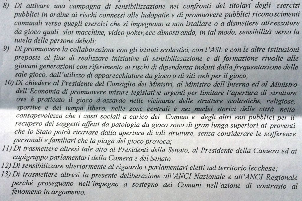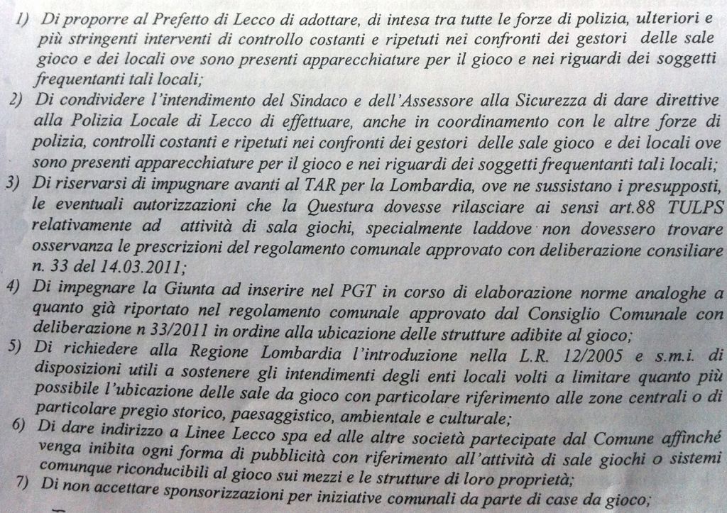 LECCO – Ieri sera, lunedì, il Consiglio comunale ha approvato all’unanimità i tredici punti della delibera con cui il Comune intende contrastare il dilagare delle sale da gioco sul territorio comunale dove se ne contano già 7. A queste si devono poi aggiungere gli innumerevoli video poker presenti in moltissimi esercizi pubblici.
