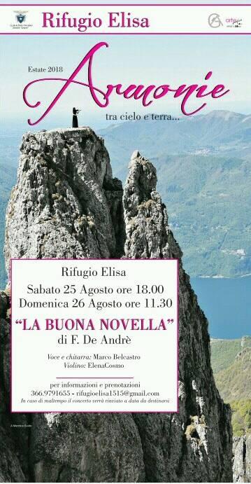 MANDELLO – Un fine settimana speciale al rifugio Elisa con “Armonie tra cielo e terra”. Elena Cosmo, violinista che da qualche mese ha preso la gestione del rifugio, sarà protagonista assieme a Marco Belcastro (voce e chitarra) de “La buona Novella” di Fabrizio De Andrè