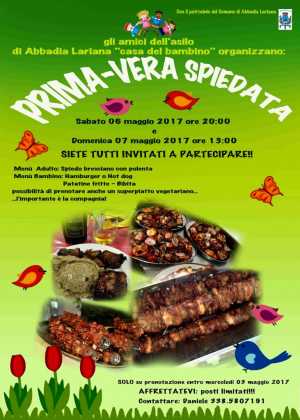 ABBADIA LARIANA – Gli Amici dell’asilo “Casa del bambino” di Abbadia Lariana organizzano per sabato 6 e domenica 7 maggio la “Prima-vera spiedata”, con invito a partecipare rivolto a tutti i cittadini.