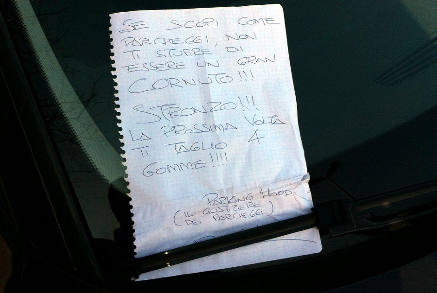 Non si tratta di un caso unico quello in questione, anzi, di biglietti minatori e non, lasciati sui parabrezza di auto mal parcheggiate se ne sono visti parecchi, sempre meno delle auto in sosta viatata. Del resto, in materia di parcheggi selvaggi (e non solo) l’educazione civica non esiste più, cancellata dalle più svariate urgenze o