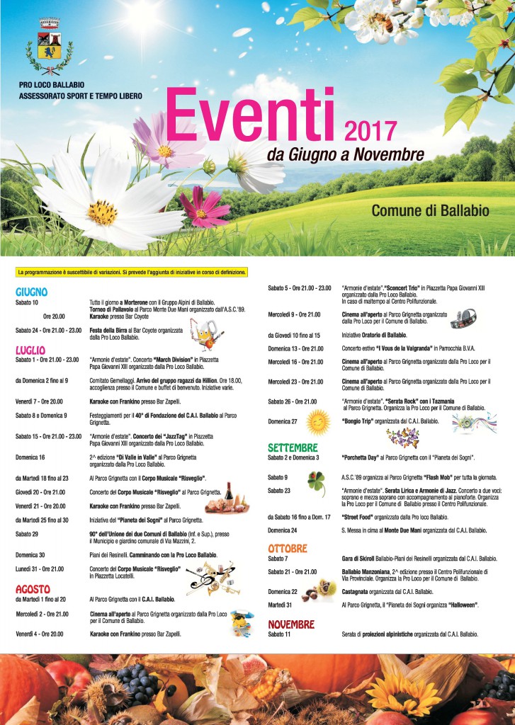 Importanti gli appuntamenti con le associazioni della montagna come il Cai (dalla “Bongio Trip”, alle escursioni, alla castagnata) e gli Alpini, e camminata anche con la Pro Loco: di grande partecipazione le iniziative di Asc ’89, Oratorio, Comitato Gemellaggi e di alcuni locali pubblici. Ma nell’estate 2017 si celebrano anche due grandi ricorrenze: il 40° di fondazione del Cai Ballabio e, il 29 luglio, il 90° dell’Unione dei due Comuni di Ballabio Superiore e Ballabio Inferiore, che verrà festeggiata nel parco della Villa Comunale.