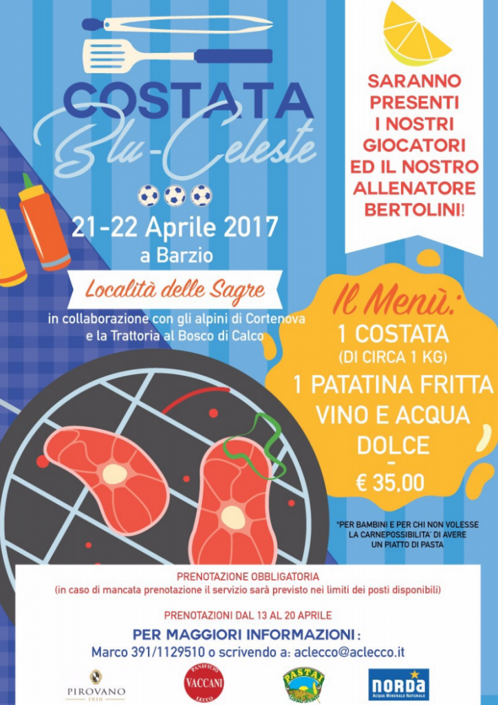 LECCO – La Calcio Lecco in collaborazione con gli alpini di Cortenova e la Trattoria al Bosco di Calco organizza per il 21 e 22 aprile (venerdì e sabato) una Costata Blu Celeste. L’appuntamento è a Barzio, in località delle Sagre.