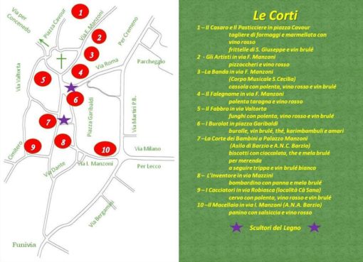 Il Corpo Musicale Santa Cecilia animerà via Manzoni, tra polenta, vino rosso e vin brulé; sempre in via Manzoni, protagonista sarà il lavoro del falegname nella nella vicina via Valtorta sarà quello del fabbro, insieme agli assaggi di funghi con polenta e ancora vino rosso.  In piazza Garibaldi ci saranno invece i ‘burolat’ con burolle, vin brulé, karimbambuli e amari. Spazio anche ai più piccoli nella Corte dei Bambini all’asilo di Barzio, dove saranno servizi biscotti con cioccolata, the e mela brulé.