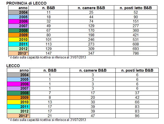I NUMERI IN PROVINCIA – Sarà stato il desiderio di utilizzare ancora quella camera lasciata vuota da un figlio cresciuto, la necessità di arrotondare le entrate familiari o la voglia di ospitare turisti e di consigliare loro come trascorrere il tempo sul ramo lecchese del Lario, fatto sta che dal 2004 ad oggi le strutture ricettive definite “B&B” sono aumentate esponenzialmente, tanto che dalle 11 presenti nove anni fa su tutto il territorio lecchese si è passati alle 147 attuali. Un dato, questo, che sta modificando significativamente l’offerta ricettiva del lecchese: se nel 2004 gli 11 B&B presenti sul territorio rappresentavano solo il 6% del totale delle strutture (ossia 182), i numeri aggiornati al 31 luglio scorso stabiliscono che nel 2013 i 147 B&B rappresentano ben il 39% delle strutture totali (371). Discorso simile vale se ci soffermiamo sul capoluogo, dove sino al 2007 si contava un solo B&B, mentre oggi ne sono attivi 21, per un totale di 96 posti letto (l’11% del totale in città). Di seguito i dati relativi alla presenza di B&B sul territorio provinciale e nel capoluogo: