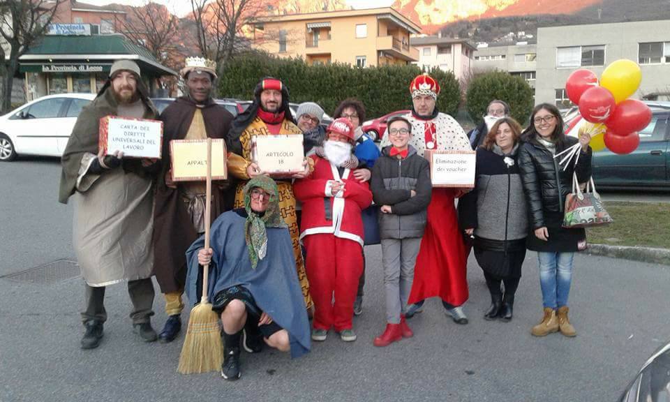 LECCO – I Re Magi, la Befana e anche Babbo Natale: dietro le tradizionali maschere natalizie, ci sono però i lavoratori del commercio e del turismo, i sindacalisti della Filcams Cgil che giovedì hanno messo in scena un flash mob in piazza Garibaldi per sensibilizzare l’opinione pubblica sulle condizioni dei dipendenti del settore.