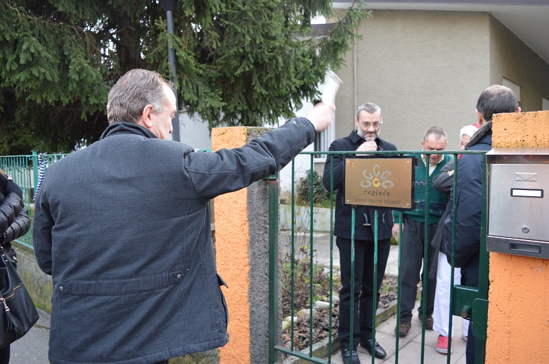 A seguito dell’intervento dell’assessore Valsecchi, Don Roberto Trussardi, parroco di Vercurago e del Pascolo, ha benedetto la sede del centro e ha invitato i presenti a uscire e posizionarsi di fronte al cancello per l’inaugurazione .