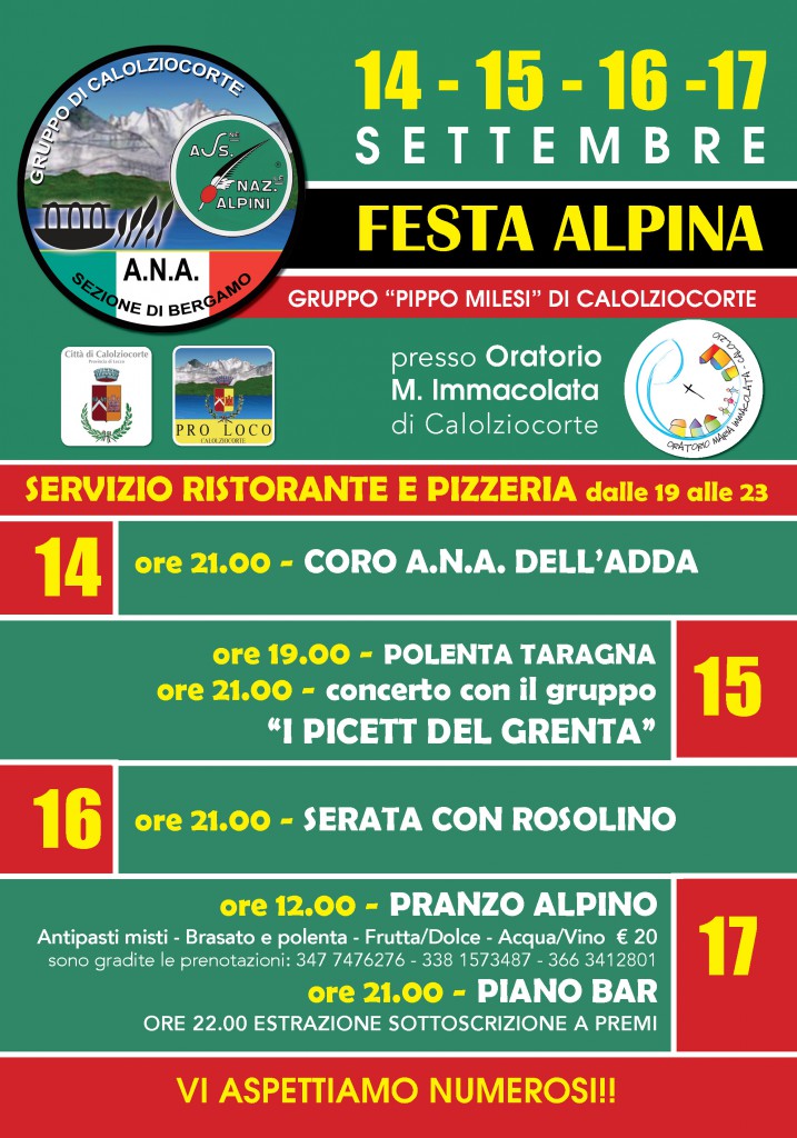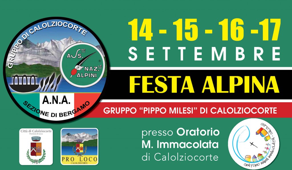CALOLZIO – Penne nere in festa questo fine settimana a Calolzio: si apre infatti il 14 settembre, giovedì, il lungo weekend della Festa Alpina del gruppo “Pippo Milesi” all’oratorio M. Immacolata di Calolzio.