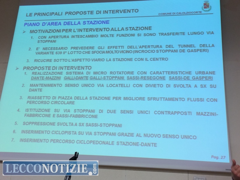 Nello specifico il piano d’area per la stazione prevede: “l’entrata delle auto da via Sassi e il doppio senso nella piazza antistante la stazione, facendo ‘circolare’ le macchine intorno alla stazione degli autobus; la svolta obbligatoria a destra in uscita da via Locatelli, e una rotonda nei pressi del semaforo di Via Galli per permettere a chi è diretto a Lecco la svolta a sinistra – ha illustrato Cola – prevede poi l’istituzione in Via Stoppani di due sensi unici contrapposti (via Mazzini – Fabbricone e via Sassi – Fabbricone) e la sostituzione dei semafori degli incroci di via Europa-Nullo-Lavello e via Marconi – Dante – Europa rotatorie a raso, così come previsto per l’incrocio di Via Galli.