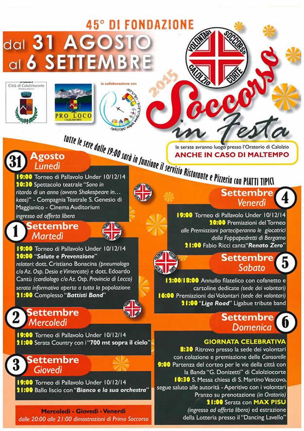 CALOLZIOCORTE – Si è aperta nella serata di lunedì 31 agosto, presso l’oratorio Maria Immacolata di Calolzio, la festa dei Volontari del Soccorso, che quest’anno festeggiano il 45esimo anno dalla fondazione dell’associazione, che garantisce, ventiquattro ore su ventiquattro, il servizio di emergenza 118 e servizi secondari fin dal 1970.