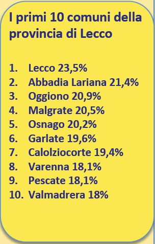 Due i comuni pavesi in graduatoria, Rocca de’ Giorgi (3° posto e 34,2%) e il capoluogo Pavia (8° posto e 29,3%) mentre fra i grandi centri ci sono anche Mantova (5° posto e 31,5%), Cremona (7° posto e 29,7%) e Brescia (9° posto e 29,2%).