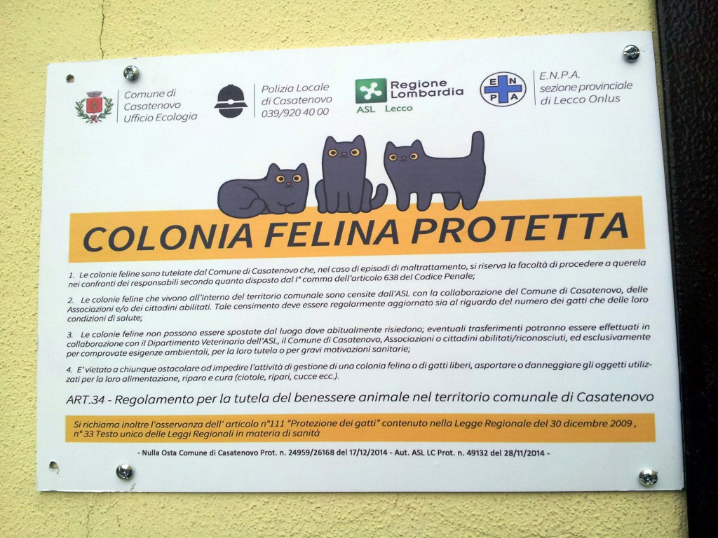 CASATENOVO  – Un piccolo grande passo nella tutela dei gatti randagi stanziati nel Comune di Casatenovo: l’Amministrazione Comunale, in accordo con l’Ente Nazionale Protezione Animali di Lecco, ASL Lecco – dipartimento veterinario e con i residenti, ha acconsentito all’installazione di un cartello per segnalare la presenza di una colonia felina protetta in via Adda, nella frazione di Valaperta, dove vivono in libertà circa sei gatti.