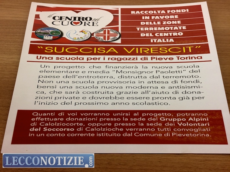 “Chiunque volesse unirsi al progetto potrà effettuare donazioni presso: la sede del gruppo degli Alpini di Calolzio e la sede dei Volontari del Soccorso; queste donazioni verranno convogliate in un conto corrente istituto dal comune di Pieve Torina. Nei prossimi mesi organizzeremo comunque presidi e ed eventi per incrementare la raccolta fondi” hanno spiegato gli organizzatori.
